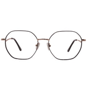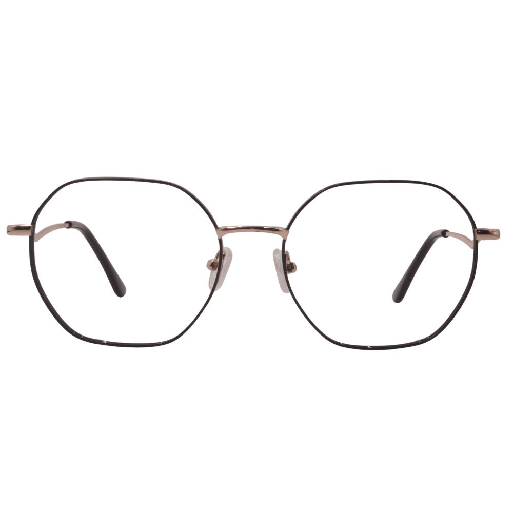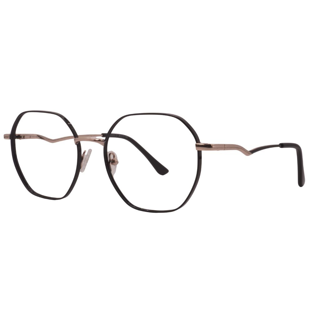 Armazón metálico con forma octagonal suave en acabado negro con detalles en oro, creando un contraste moderno y elegante. Su diseño delgado mantiene un estilo ligero y cómodo, ideal para uso diario. Incluye plaquetas ajustables para mejor soporte y varillas finas con puntas suaves que se adaptan bien al rostro.